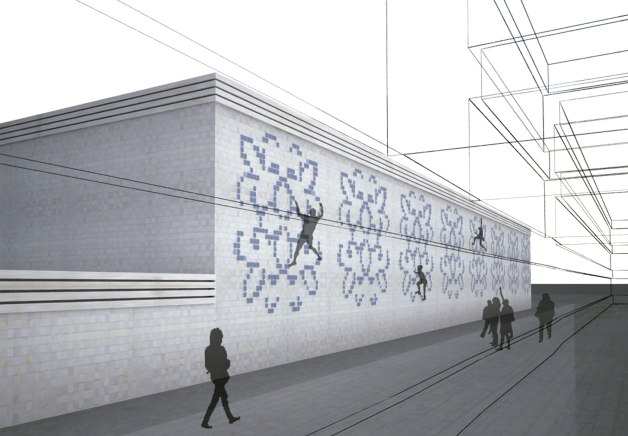To bring new life into a forgotten urban space, this design turns the closed back wall of a museum into a climbing wall using an adaptation of local traditional ceramic tiles.